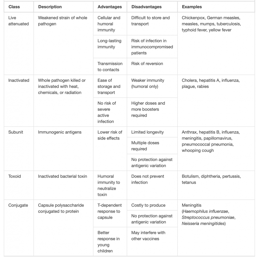 For a vaccine to provide protection against a disease, it must expose an individual to pathogen-specific antigens that will stimulate a protective adaptive immune response. By its very nature, this entails some risk. As with any pharmaceutical drug, vaccines have the potential to cause adverse effects. However, the ideal vaccine causes no severe adverse effects and poses no risk of contracting the disease that it is intended to prevent. Various types of vaccines have been developed with these goals in mind. These different classes of vaccines are described in the next section and summarized In the table.