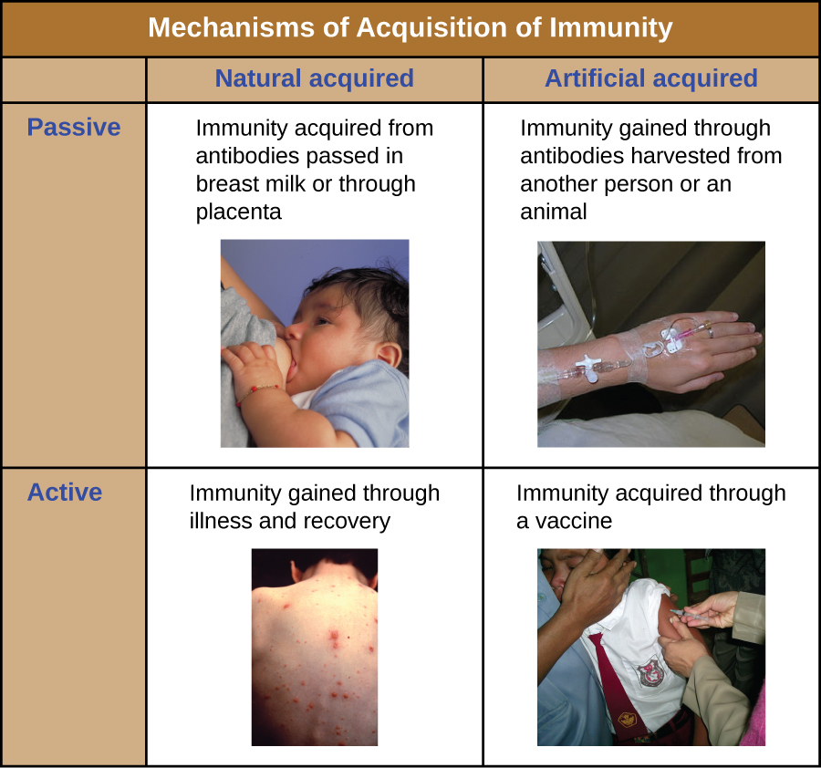 Active immunity refers to the activation of an individual’s own adaptive immune defenses, whereas passive immunity refers to the transfer of adaptive immune defenses from another individual or animal. Active and passive immunity can be further subdivided based on whether the protection is acquired naturally or artificially.
