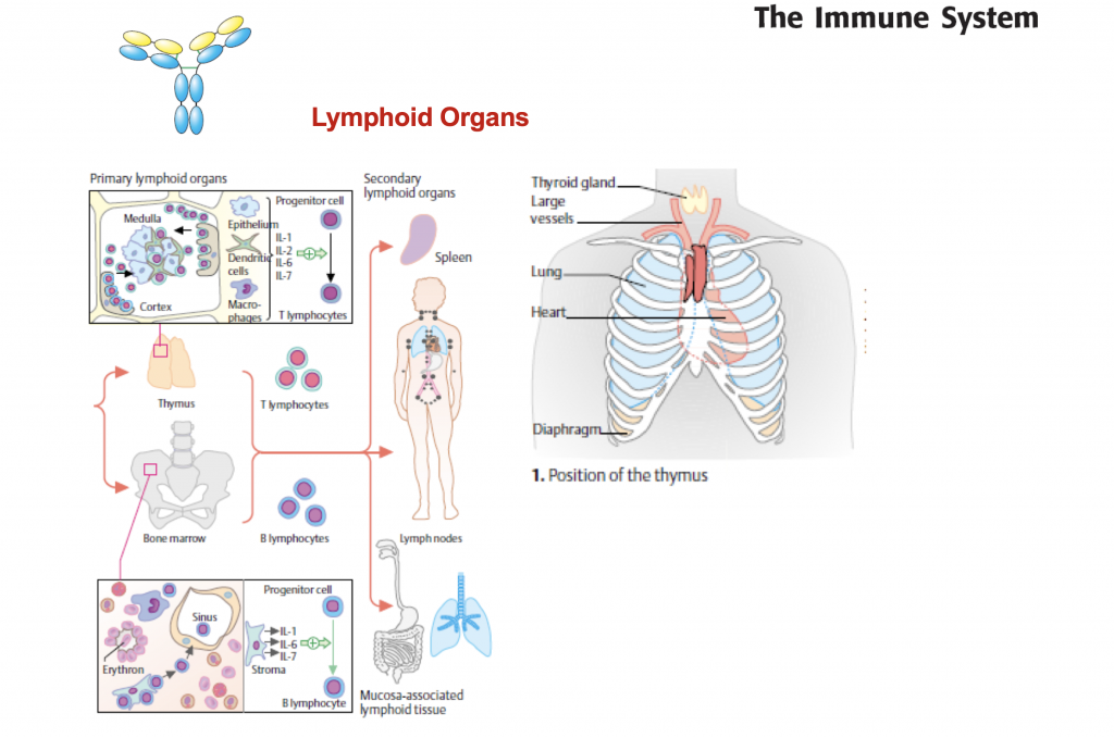 - Primary lymphoid organs: These organs include the bone marrow and the thymus. They create special immune system cells called lymphocytes.