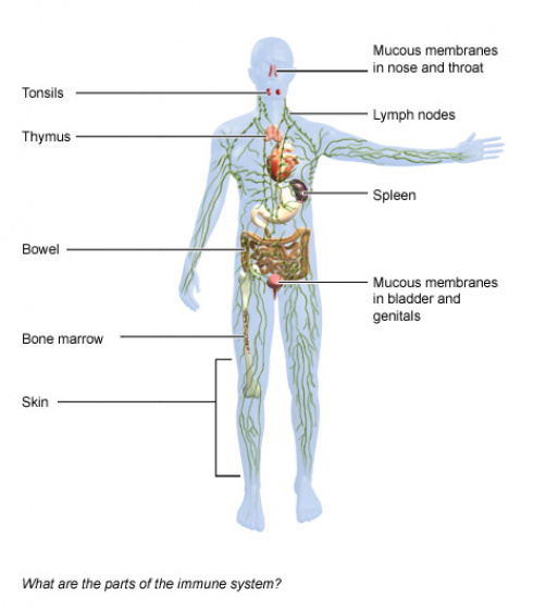 - Secondary lymphoid organs: These organs include the lymph nodes, the spleen, the tonsils and certain tissue in various mucous membrane layers in the body (for instance in the bowel). It is in these organs where the cells of the immune system do their actual job of fighting off germs and foreign substances.